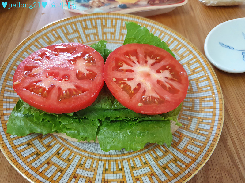 3. 구워진 빵에 상추 - 토마토 - 치즈 - 계란 - 햄 순으로 올려줍니다.