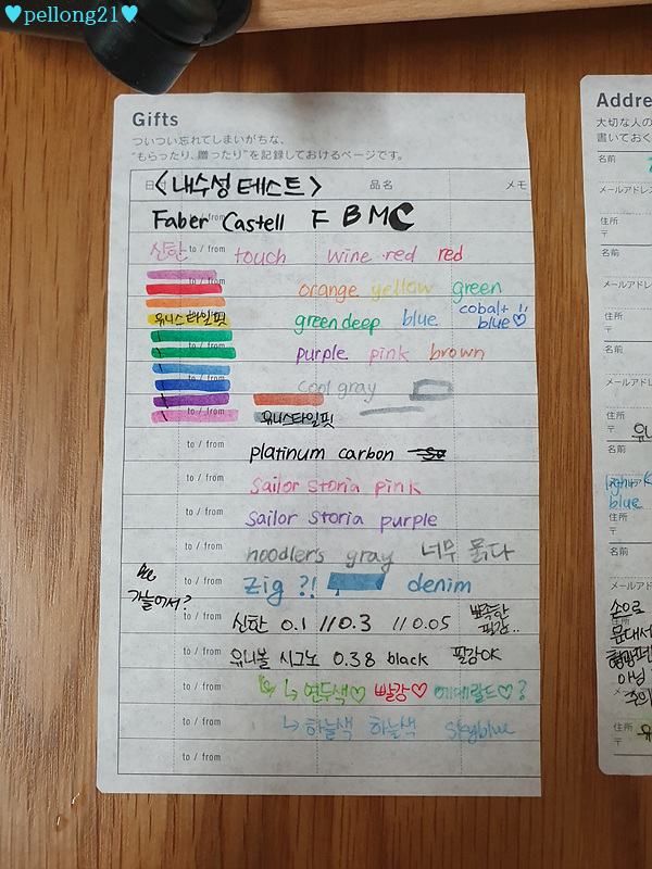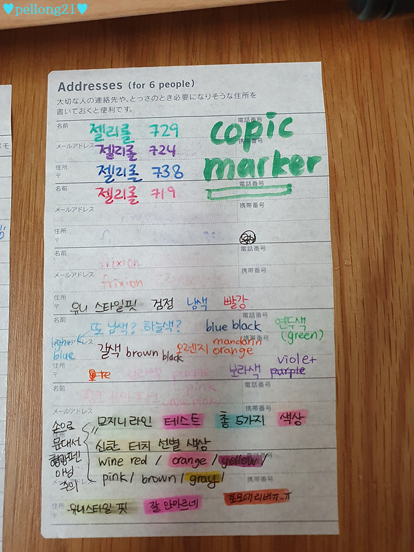 형광펜도 궁금해서, 형광펜과 다른 컬러 펜들도 (다이어리에 평소 사용하지 않지만) 그냥 써봤는데요, 의외로 유니 스타일 핏의 특정 색깔은 물에 약한 모습을 보여주고 있습니다.