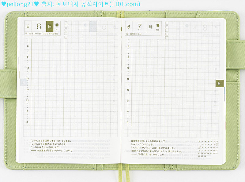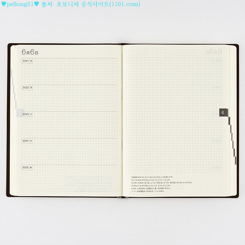 영어버전은 A6 오리지널 사이즈에서만 제공하고 있습니다. 호보니치의 특징 중 하나는 매 페이지 하단에 명언이 쓰여있는 것인데요, 이것을 일본어로 읽기 싫거나, 읽을 수 없는 외국인인데 이 글을 원하지 않으면 planner를 선택하면 됩니다. 언어와 맨 뒤의 정보페이지들? 리스트나 각종 정보 페이지의 구성에서 약간의 차이가 있습니다.
