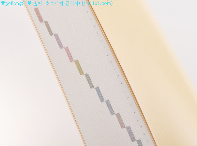 마지막으로 다른 특징들이 많지만, 인덱싱 되어 있는 사진을 가지고왔습니다. (다른 자세한 특징들은 홈페이지를 봐주세요: www.1101.com/home.html) 아래와 같이 매월 컬러로 표기되어있습니다만, 따로 인덱스 스티커를 붙이는 것이 더 편할 것 같아요. 저는 인덱싱을 월별로 하진 않고, 인덱싱 스티커 중 뗏다붙였다 하는 것 중에서 튼튼한걸 골라서 매일 작성할 곳 한 곳만 표시해요. 책갈피보다 더 빠르고 편하거든요.