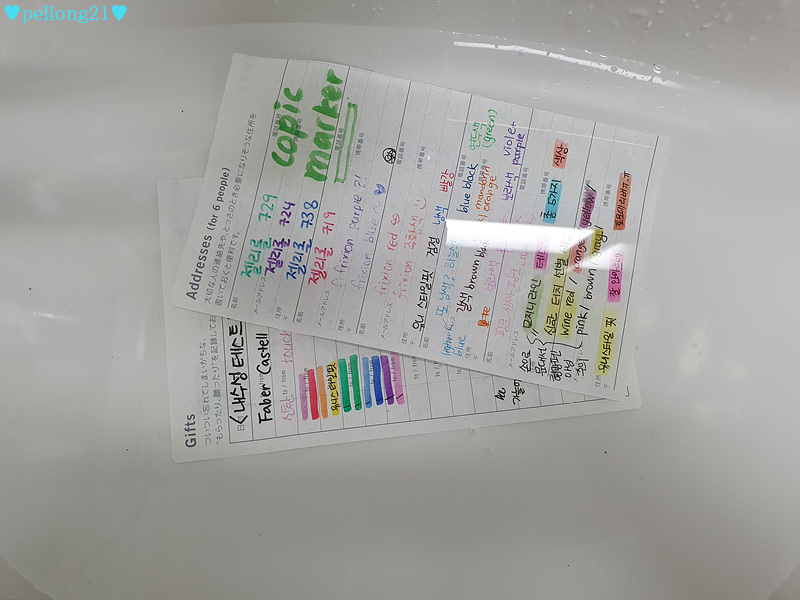 제가 테스트해본 결과도 공유해보겠습니다. 아래와 같이 가지고 있는 펜을 종류별로 써서, 물을 칠하다 못해 그냥 10분간 담궈두었습니다. 종이는 똑같은 토모에리버 종이, 호보니치 수첩에서 안쓰는 페이지를 잘라내었어요.