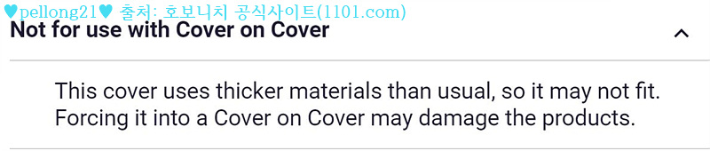 요 지그재그에 꽂혀서..샀는데, 사기 전에 주문 오류 낼까봐 자세히 읽어보다가 발견했어요. 이게 소재가 약간 PVC 소재?가 섞여있는지, 커버 온 커버(cover on cover)를 사용하지 말라고 쓰여있습니다. 친절하기도 해라...... 그래서, 비닐 커버는 구입하지 않았습니다.