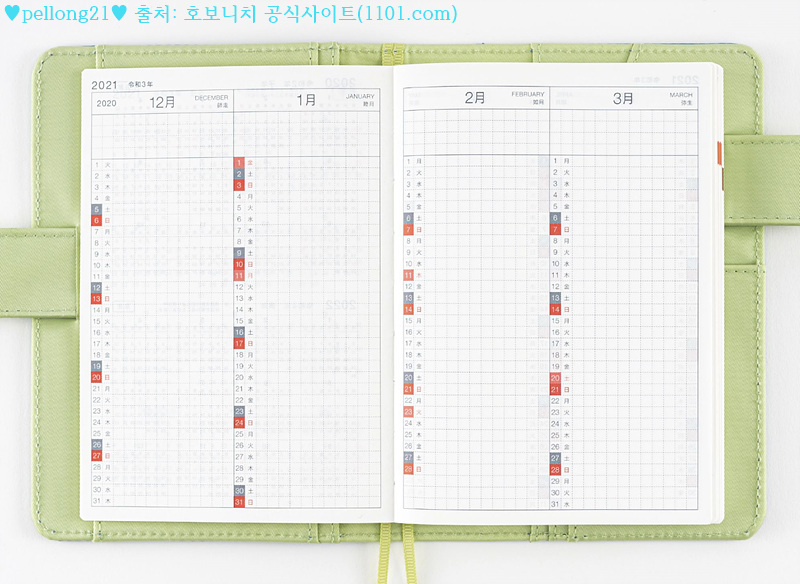 기본적으로 구성은 planner(영문), original(일본어, 매일 한 페이지), original avec(일본어, 매일 한 페이지, 그러나 두 권으로 분권되어 반년에 한권씩 사용하는 2권짜리 세트), day-free(일본어, 먼슬리 바로 뒤부터 날짜 표기 없는 자유 페이지로 구성) 이렇게 4가지 종류입니다.