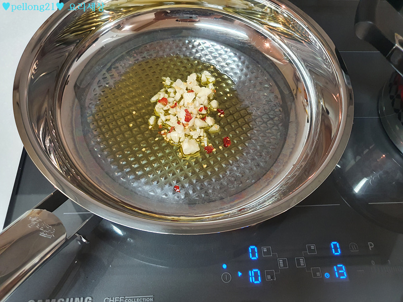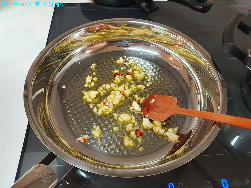 4. 올리브유 두르고 마늘, 페페론치노 볶아주세요.