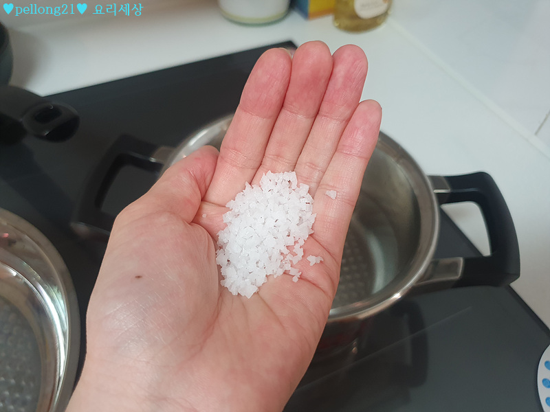 - 소금은 아래만큼 넣었어요. 유투브나 블로그들 보면 요새 소금 비율이 있더라구요. 물 1L마다 소금 10g?