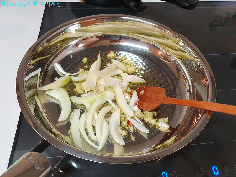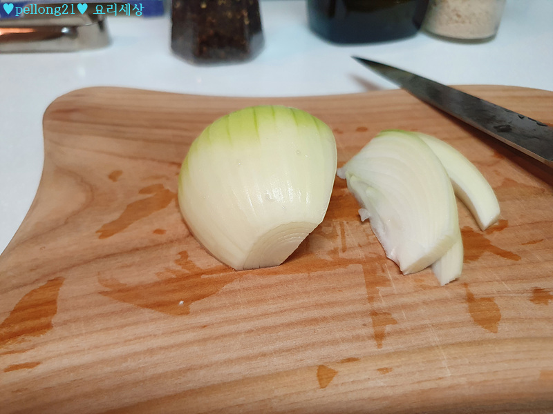 양파는 이런식으로 중심을 기준으로 호 (부채꼴) 모양으로 썰면 쭉 길게 썰려요. ㅎㅎㅎ 처음엔 좀 낯설었는데, 매번 이렇게 자르다보니까 조금씩 익숙해지고 있어요.