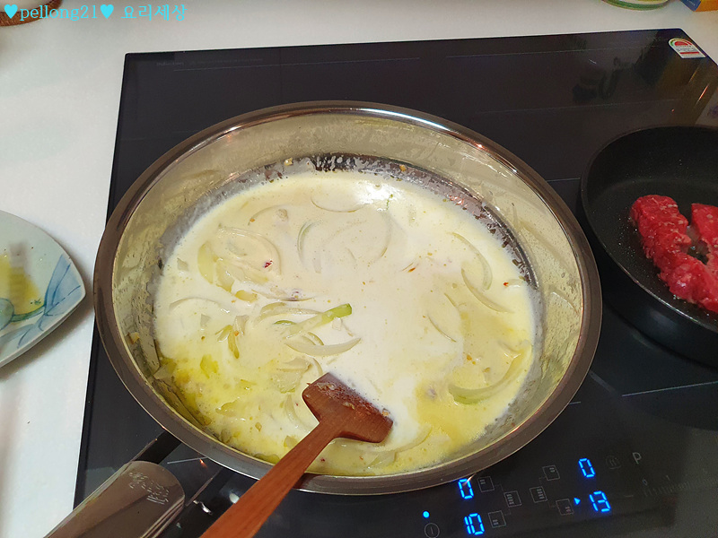 8. 그러다보면 양파가 좀 익어요. (너무 익히면 흐물거리고 너무 달아져요. ) 그 때 생크림 100ml, 우유 100ml 넣고 끓여주세요.