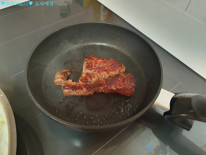 고기는 한 번만 뒤집어야된다는 미신을 대학 때까지도 믿었는데요.. 스테이크는 상관 없는 것 같아요. 저는 여러번 뒤집어주고 옆면도 익히고 겉면을 거의 태우듯이, 바삭하게 익히는 것이 맛있더라구요.
