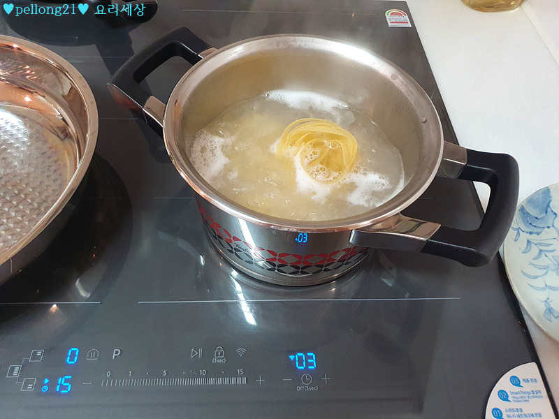 봉지에 표기된 알덴테(Al dente) 시간보다 2분 덜 삶아주시면 되어요. (소스에 넣어서 더 익힐꺼고, 그릇에 담으면서 잔열로 또 익어요. )