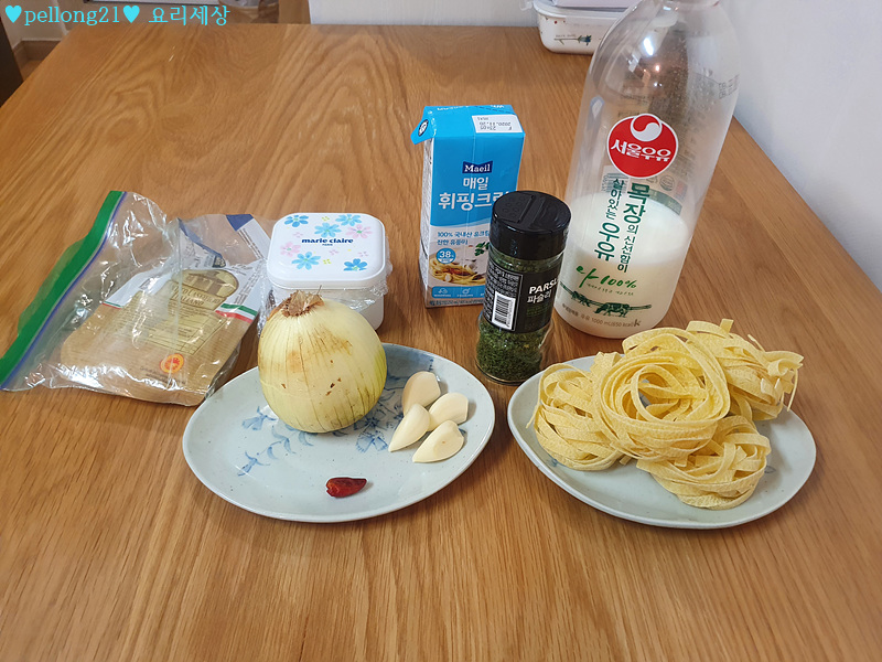 파스타: 파스타 면, 양파, 마늘, 페페론치노, 우유, 생크림, 파슬리, 치킨스톡, 파마산치즈