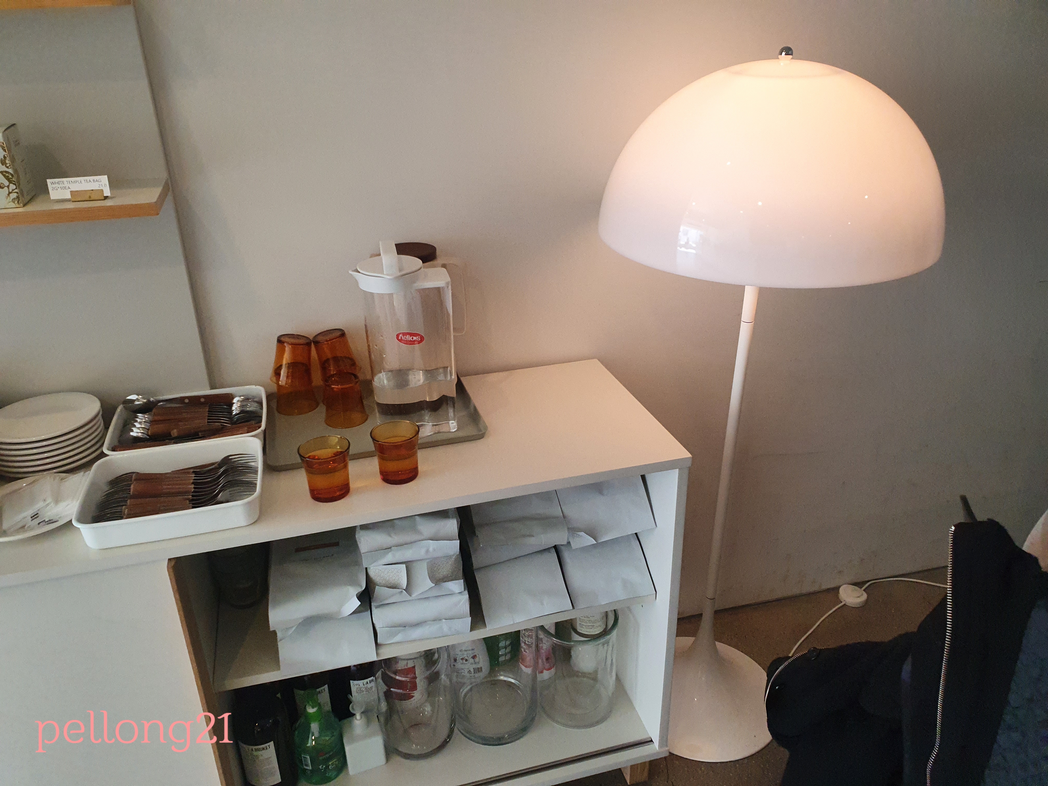 수저, 접시 등은 셀프입니다. 마마스 카페처럼요~ 아무래도 레스토랑처럼 종업원이 있기는 힘들기도 하고, 그렇게 가게가 넓지 않기 때문에 자연스럽습니다. 뜨거운 물이 비치되어 있어서 따뜻한 물을 항상 시켜먹는 저로서는 반가운 일이었습니다. !