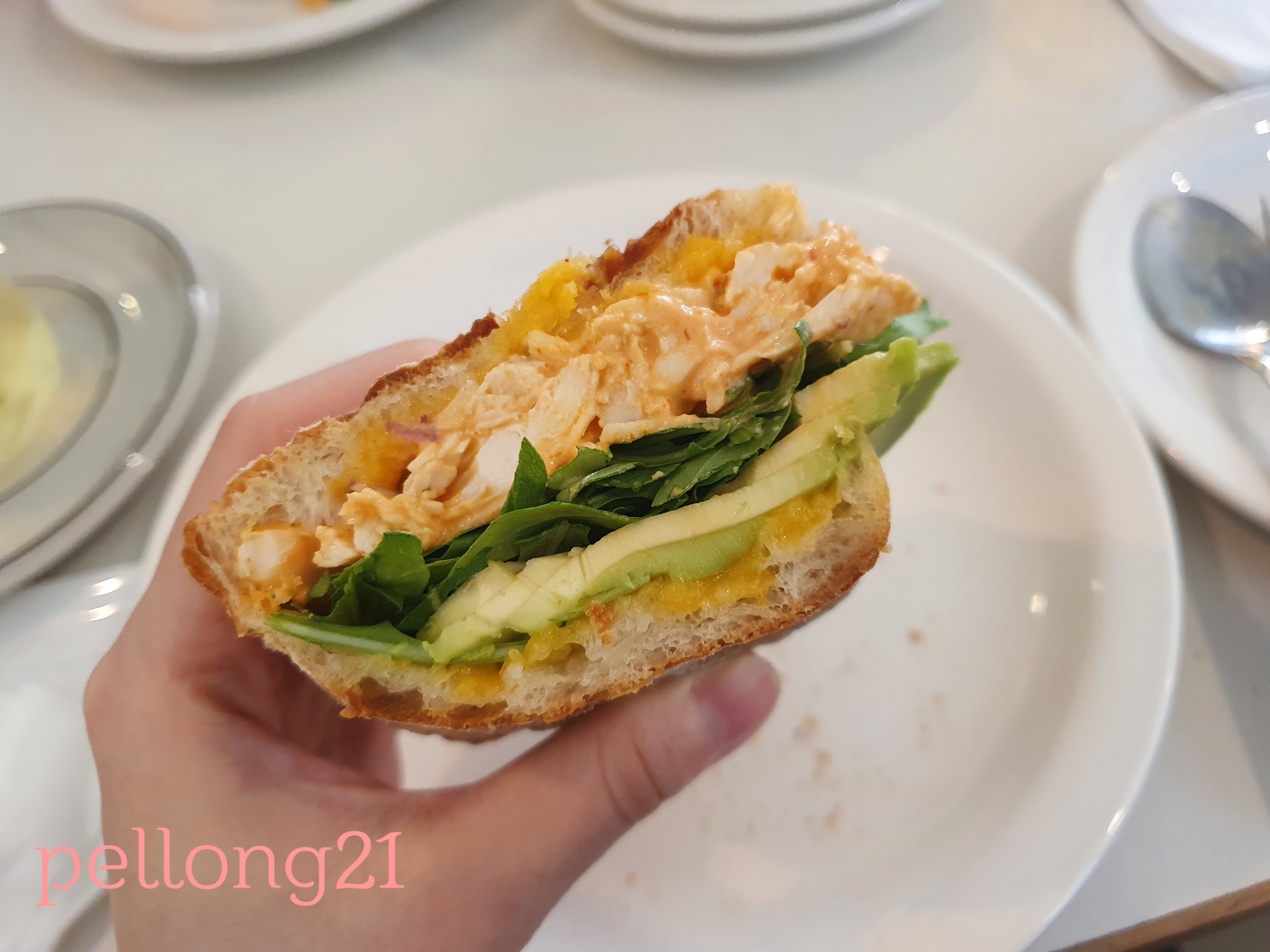 제가 먹었던 쪽의 샌드위치 속을 열어보면 이렇습니다. (윗 사진의 왼쪽 부분이에요. ) 아보카드 3조각. 다시 보니 좀 너무하네요. ㅋㅋㅋㅋㅋㅋㅋ 먹을 땐 불만 없이 괜찮게 먹었는데요. 지금보니 너무 창렬한 아보카도. 1만원 넘게 지불하면서 이런 모양을 기대하지는 않았는데요.