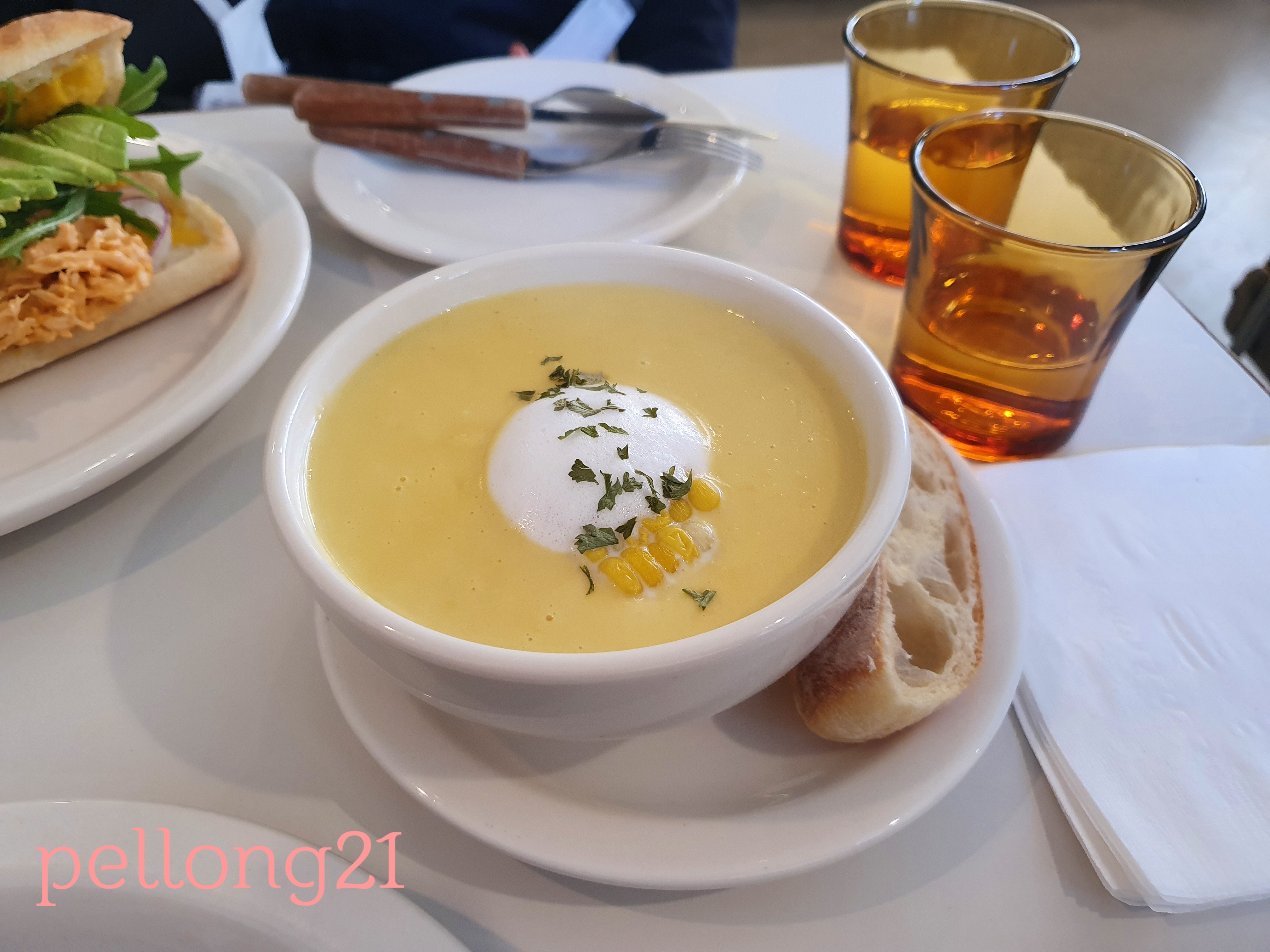 그리고 샌드위치만 먹기 조금 아쉬워서, 초당옥수수 스프도 시켜보았습니다. 왠지 따뜻한 것 먹고 싶은 날씨기도 했고, 임당 재검을 마친 직후라 배도 고프고요.