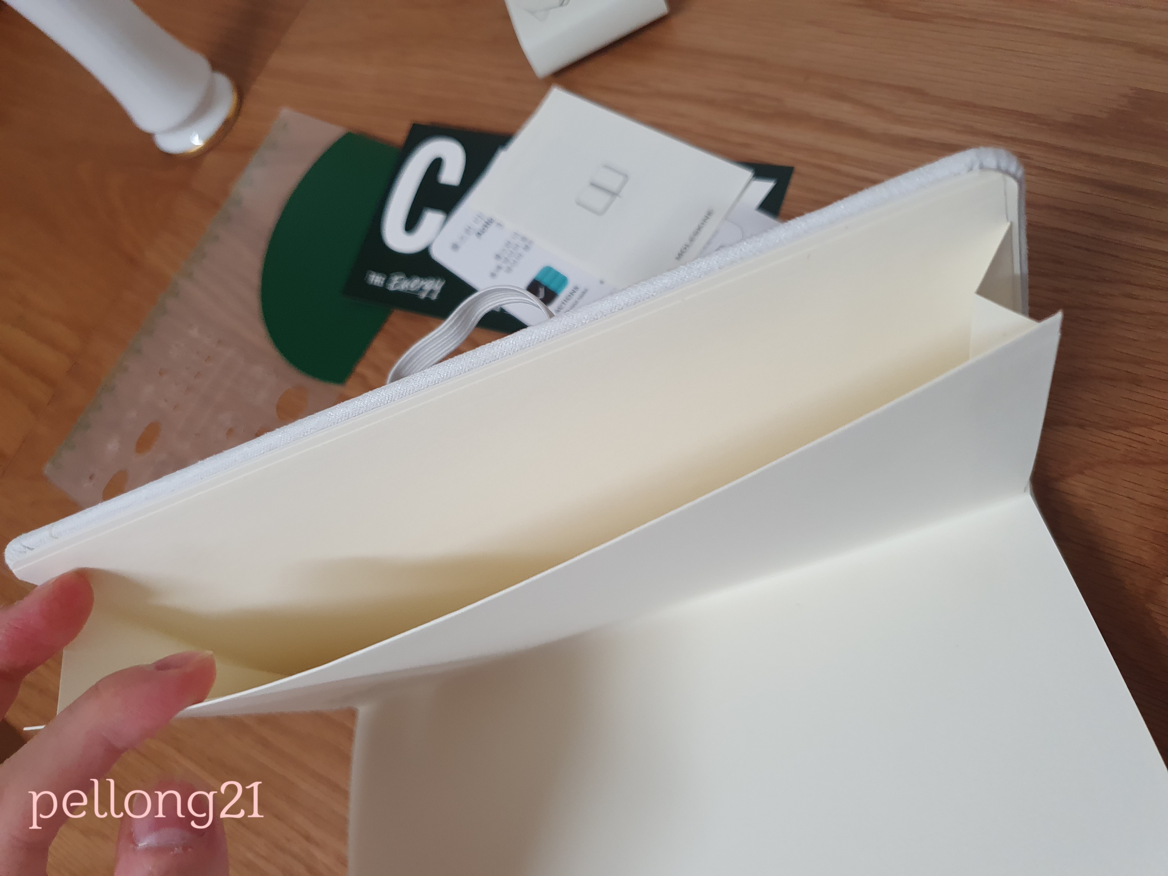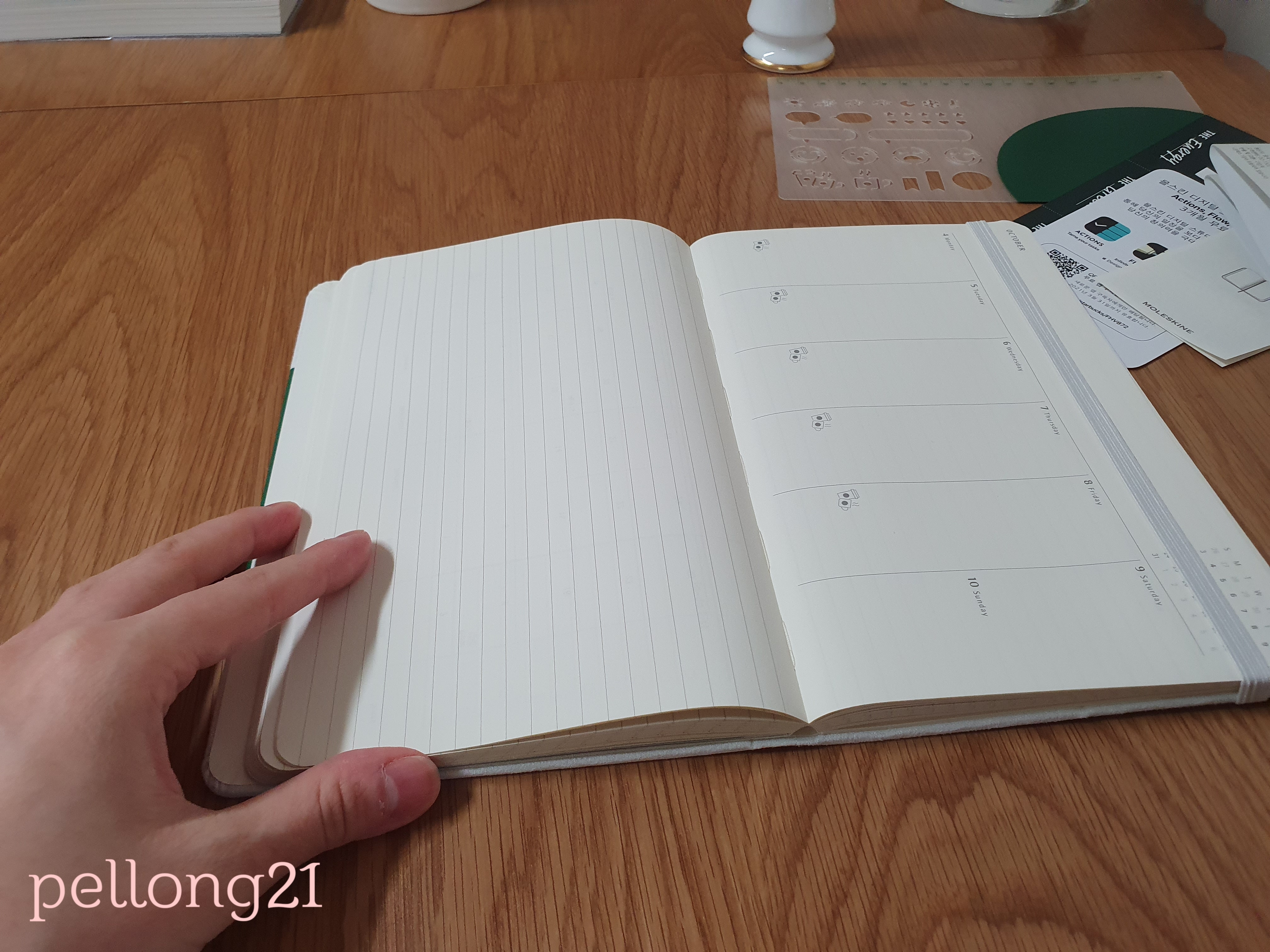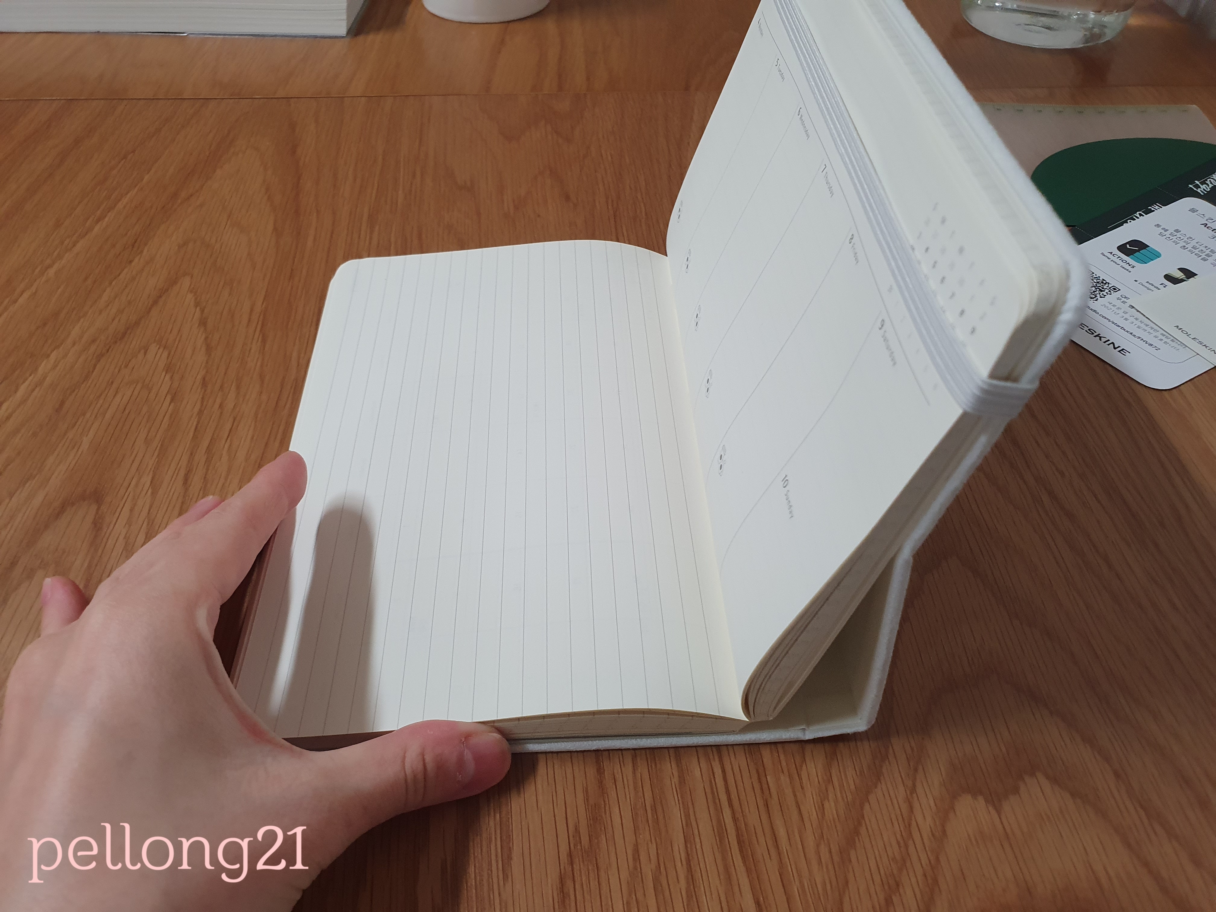 첫 장을 펼치면, 이렇게 생겼어요. 조금 특이하죠? 원래 맨 앞 표지가 저 공책등 부분도 붙어있고 연결되어 있어야 하는데 말이죠.. ㅋㅋㅋ 스탠딩 스케줄러기 때문에 스탠딩을 안정적으로 하기 위해서 이렇게 되어있는데, 막상 펼쳐서 글씨 쓸때 불편하지 않도록 쫙쫙 잘 펴지더라구요.