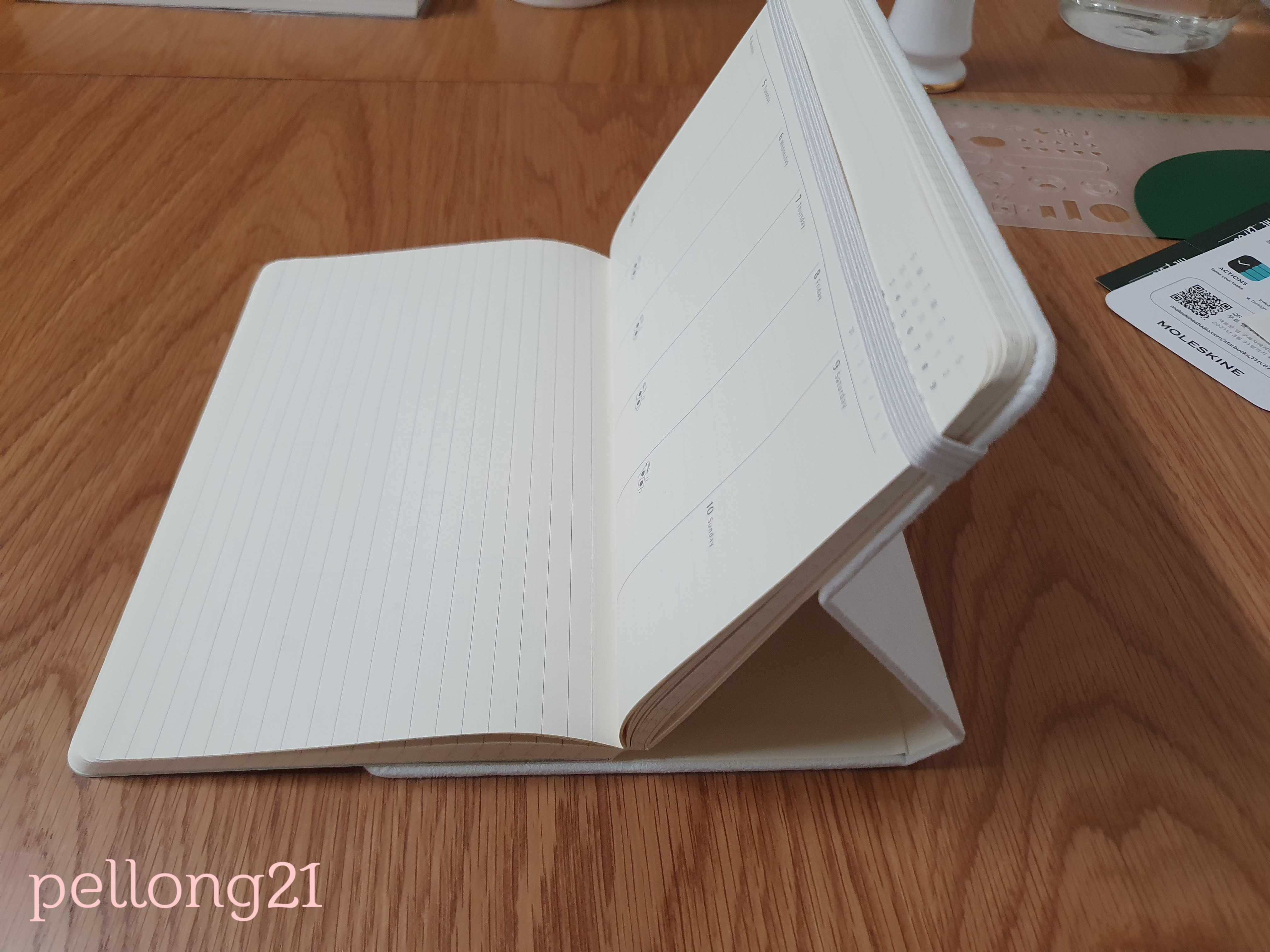 펼쳐서 사용할 땐 다시 이렇게 됩니다. 쭉 미니까 그냥 펴지더라구요. 글씨를 쓸땐 이렇게 해야겠죠? 아 아무튼 정말 편리하게 세웠다가 눕힐 수 있고, 칸도 딱 제가 원하는 위클리라 너무 좋아요. ^^