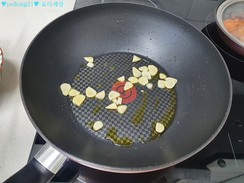 3. 마늘 넣어 조금 향을 내주세요. 많이 익힐 필요 없어요! 그냥 향만 조금 내고 바로 양파 넣을거에요!
