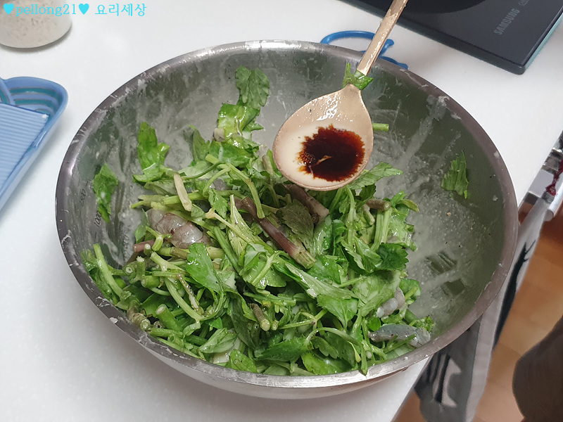 4. 반죽에 새우와 미나리를 넣어주세요. 퐁당퐁당. ^^